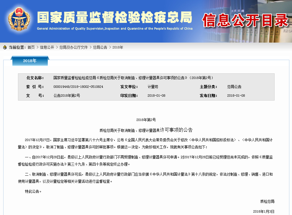 最新消息!質(zhì)檢總局關(guān)于取消制造、修理計量器具許可事項的公告